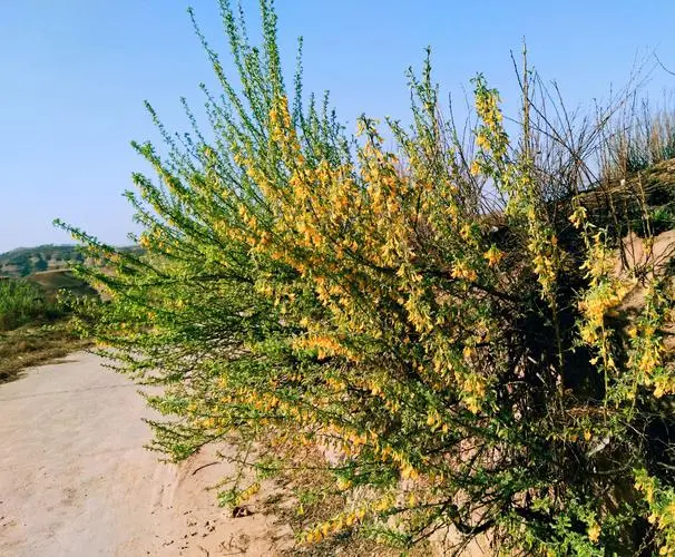 柠条锦鸡儿,豆科锦鸡儿属灌木,俗称柠条,喜光,极耐干旱和高温,既抗大气干旱,也较耐土壤干旱,多生长于贫瘠干旱沙地、黄土丘陵区、荒漠和半荒漠地区均能生长。幼时呈小乔状;老枝金黄色,有光泽;嫩枝被白色柔毛。花冠旗瓣宽卵形或近圆形。荚果扁,披针形。花期5月,果期6月。拧条锦鸡儿枝叶可作绿肥和饲料。茎皮可制“毛条麻”,供搓绳、织麻袋等用。开花繁盛,为优良蜜源树种;是西北地区营造防风固沙林及水土保持林的重要树种。分布于中国内蒙古(伊克昭盟西北部、巴彦淖尔盟、阿拉善盟)、宁夏、甘肃(河西走廊)。